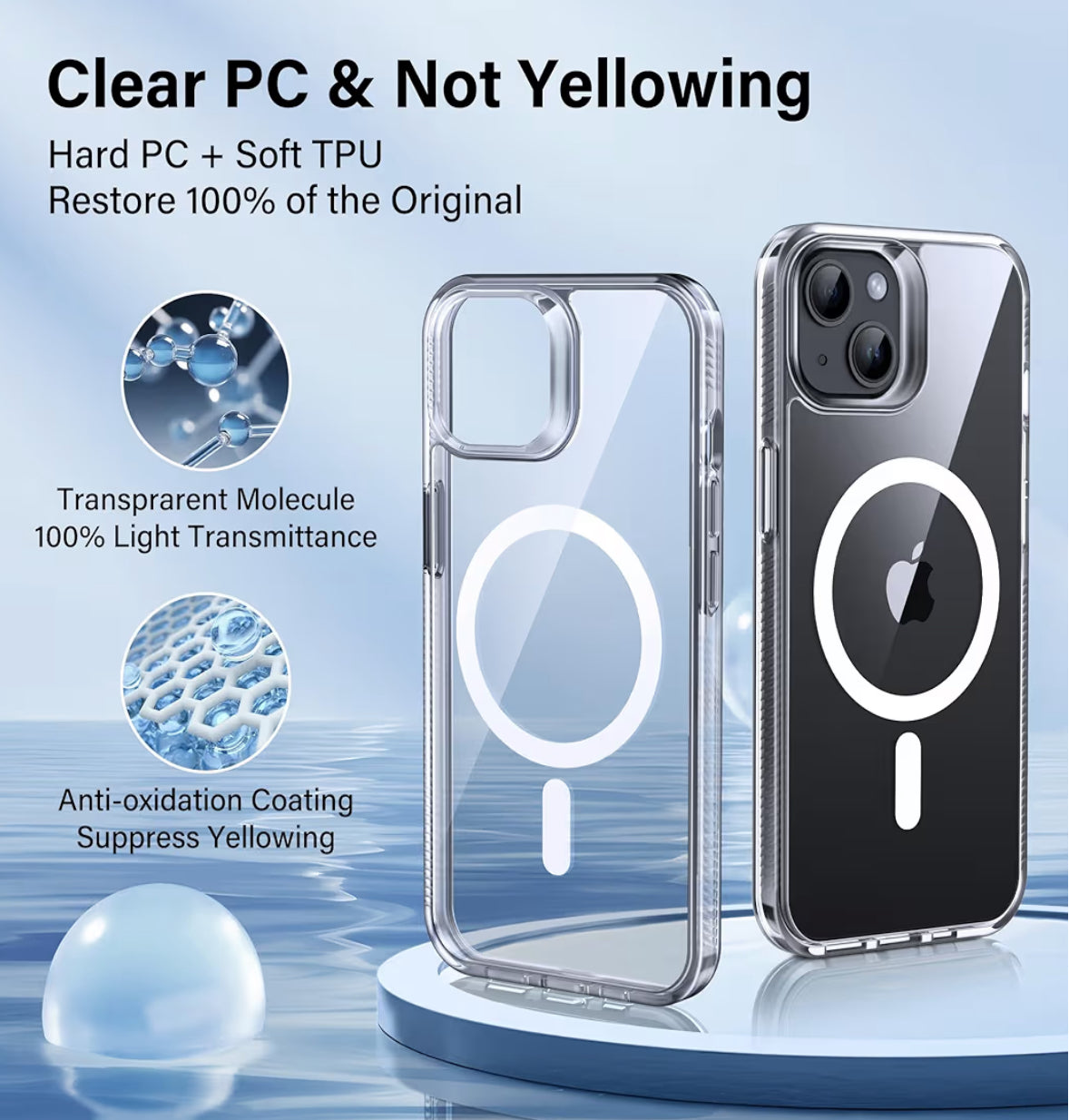 - PC transparente y no amarilleo: fabricado con policarbonato duro ultra claro de alta calidad y material de TPU suave. El revestimiento a prueba de aceite utiliza componentes antioxidantes, que pueden resistir eficazmente el amarillo, mostrar perfectamente el color original y el logotipo de tu iPhone.