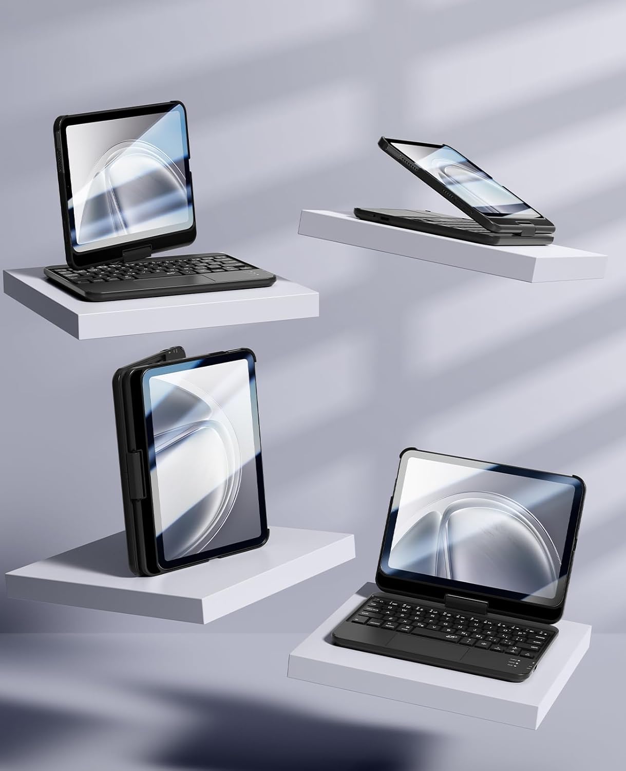 - Rotación libre: Con una funda de teclado en tu iPad, tendrás un agarre inquebrantable y una experiencia de escritura sorprendentemente cómoda. Diseñado con una bisagra de rotación libre de 360°, tiene la máxima libertad al usarlo y se puede utilizar en múltiples posiciones. El teclado tiene un diseño todo en uno, y el diseño elegante es perfecto para escribir sobre la marcha, proporcionando una mejor experiencia de transporte para tu iPad.