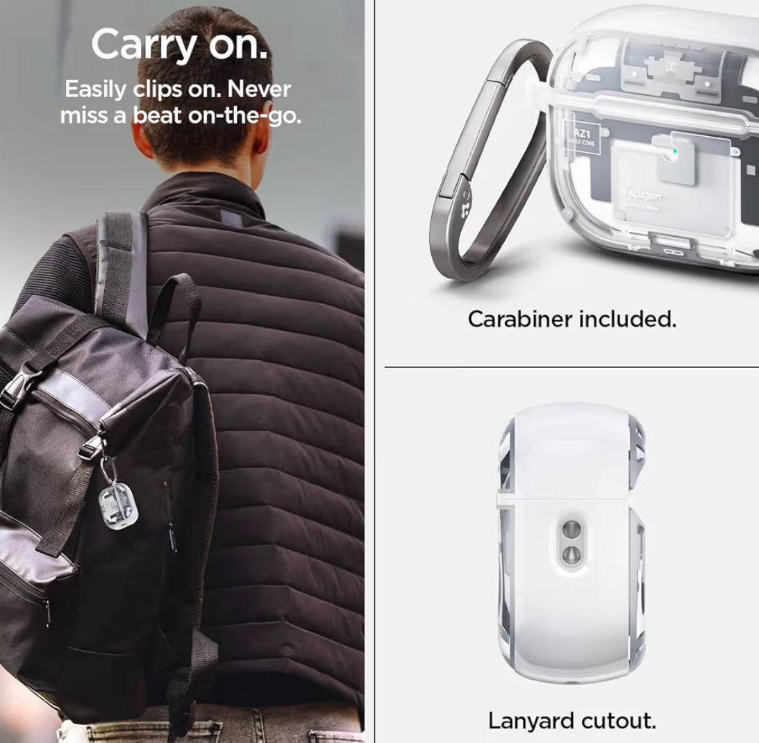 • Mosquetón incluido para una fácil portabilidad y transporte diario. Recorte en el lateral para compatibilidad con el cordón.